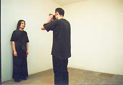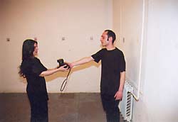 Konstantin Adger is the representative of the young artist's group named "Emergencyna exit", who demonstrate refusal of critics and return to the universal themes and values, also actively applying potential of new technologies. Here Polaroid camera is the instrument of communication, being in touch with Him and Her in space and time. During performance action Konstantin Adger and Marina Bebick are making circle by the perimeter of galleries walls, photographing each other in rotation. By turn expressions and video documentary as an artifact has been staying from the participants of the action after performance termination.