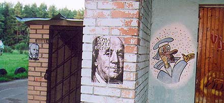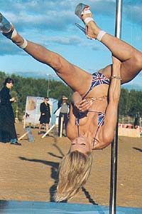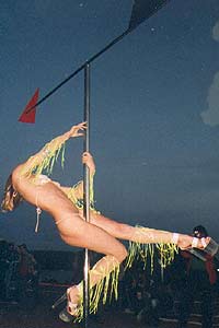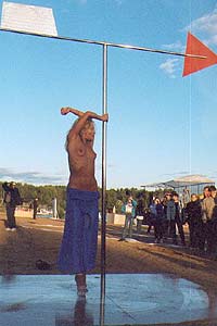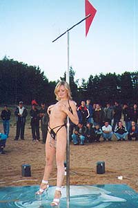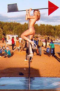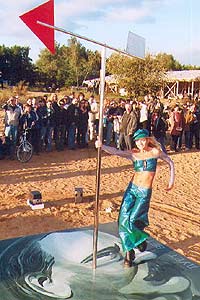 "Standing out against this background was a performance of the ESCAPE group "Where the wind blows", which seemed to be an only statement at the festival. Two half-naked girls were "working" for two hours around a pole (which was also a weathercock) fixed on the beach. The dance floor for them was a picture of an American president from a thousand dollar bill. The critical message implied was as follows: "Here you are - get stuffed! If you don't want art, but want shows - look at the nude chicks."
