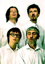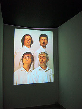 Four people are singing four songs simultaneously. Four different persons, four different songs, four different mimics. But the audience hears only some noise which happens in concert hall before the beginning of any performance. At the end of this silent action audience hears applauds.