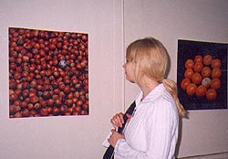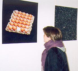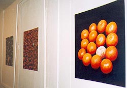 Многочисленные предметы - в основном съедобные - сняты так, что создается ощущение неисчислимого множества. На каждой фотографии в это множество включен предмет, родственный массе, но визуально отличающийся от ее составляющих. То есть из массы выбивающийся. Среди грязной картошки - одна чисто вымытая, в грозди черного винограда - белая ягода, в сетке с сырыми яйцами - одно вареное и очищенное...