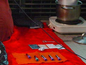 Материалы: электрическая плитка, 5 кг мыльной основы, мои волосы, ногти, 5 пробирок с моей кровью, 2 кастрюли, ножницы, мои туфли, мои визитные карточки, нож.