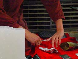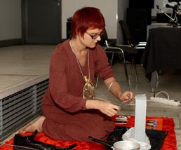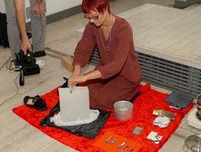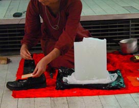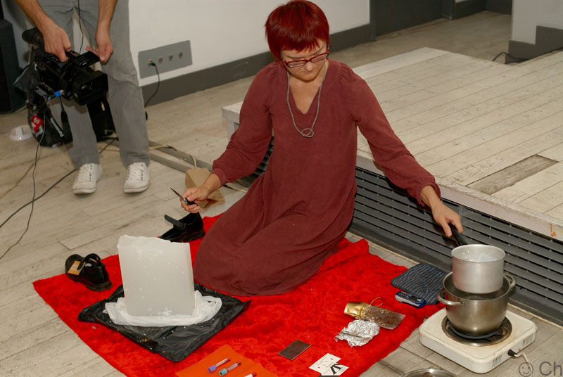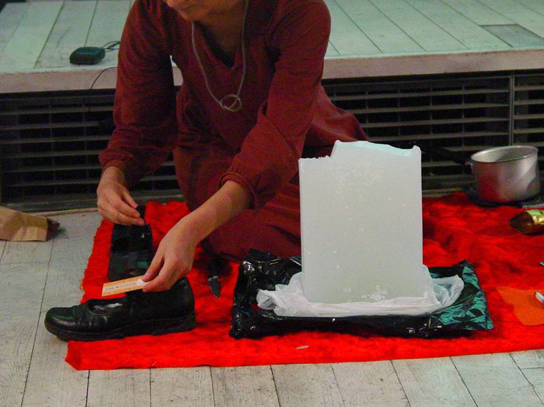 Действие: Я плавлю на водяной бане мыльную основу, добавляю туда инградиенты – собственную кровь, волосы и ногти. Полученную смесь заливаю в формы – собственные туфли, сверху кладу визитные карточки.