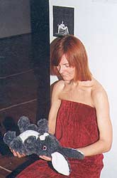 Я, одетая в красное, держу игрушечного зайца в позе пиеты.