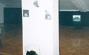 Человек в белом плаще кружит по вечереющему парку, запорошенному первым снегом... Вьющийся по ветру плащ мелькает то вдалеке, то близко; и вот уже мы видим совсем рядом сосредоточенное лицо... Над ним - отражение в воде: ещё одно лицо. Неуловимо похожее на то, первое. Как будто небо и земная хлябь меняются местами. Это образ покойного отца. (Видеоинсталляция Владимира Быстрова "Пейзаж" на выставке "Запасный выход в Арт- Коллегии".) Элегантные белые стены галереи, привыкшие к шагам зрителей, рассматривающих картины или фотографии, казалось, расступились, впустив в себя работы учеников и соратников известного московского художника Юрия Соболева, создавшего четыре года назад в Царском Селе Мастерскую паратеатральных форм при Международной Мастерской Театра Синтеза и Анимации "Интерстудио".