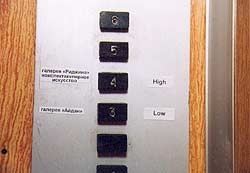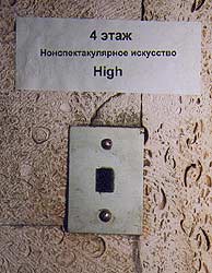 Незрелищность ни в коей мере не равна профанности, а зрелищность - сакральности. Нонспектакулярность подразумевает другой язык и другие смыслы. Поэтому тот факт, что галерея "Риджина" с выставкой нонспектакулярного искусства расположена как раз на 4 этаже со сделанной мною надписью "высокое" прошу считать простым совпадением. На самом деле, нонспектакулярность может находиться равновероятно на 5-ом, 2-ом или 1-ом этажах, она может также внезапно обнаружиться между этажами, на улице или в голове кого-то из зрителей и т.д. и т.п. То же самое относится к галерее "Айдан", ни в коей мере не подпадающей, по моему мнению, под понятие "низкого".