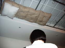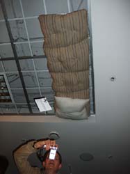 Один из матрасов прикреплён на потолке своей нижней частью, как если бы потолок стал для него полом. Под ним на полу пустое место. Проект построен на сдвижке восприятия зрителя. На полу галереи были разложены матрасы, что и явилось поводом для перемещения одного из них на потолок. В 60-е годы в парижской галерее открылась одна выставка. Изумлённые зрители ничего не обнаружили, точнее, увидели пустое помещение. Когда хотят сбить с толку и тем самым помочь выйти из тупика, кроме невозможных, фантастических идей, предлагают просто посмотреть под другим углом, изменить ракурс, использовать другой масштаб или поменять обстановку. Мы решили, что нужно внутри насыщенной артефактами групповой выставки сделать произведение без его материального воплощения, создать пустоту. Поэтому, придумывая проект, мы стали говорить ни о чём.